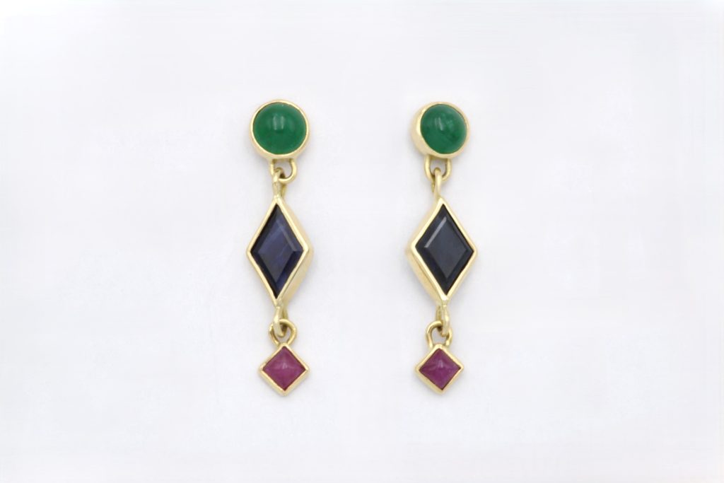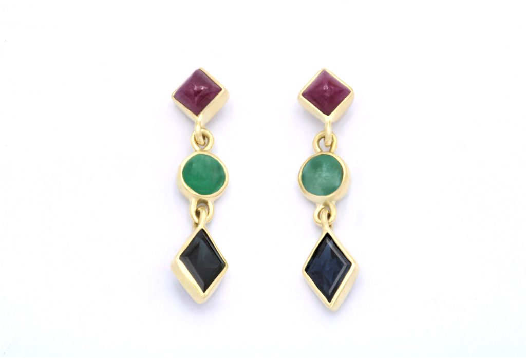 Handmade K18 gold earrings with round cabochon emeralds, square faceted saphires and square cabochon rubies.