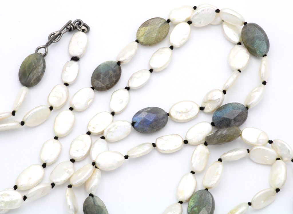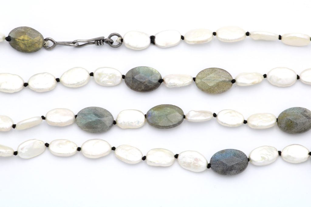 Κολιέ με λαμπραντορίτες και μαργαριτάρια περασμένα σε μαύρη κλωστή με κόμπους και επιροδιωμένο ασημένιο χειροποίητο κούμπωμα.